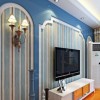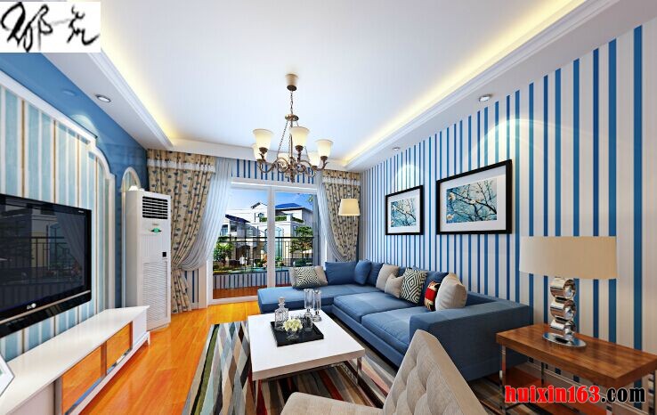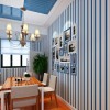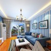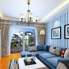 一进到客厅中我们便会感受到一种清新感扑面而来,客厅中的石膏板吊顶采用了平顶式的设计,在四周做了简单的夹层设计,并在夹层处安装了一圈暖黄色的灯带,灯光可以将吊顶照射的非常柔和,中间则悬挂了一盏具有复古特点的灯饰,电视背景墙使用了石膏板做了简单的边框造型设计,中间的墙面上则粘贴了竖条纹的壁纸做装饰,清新、淡雅的色彩搭配,可以在人们长时间观看电视时保护好人们的眼睛不受到伤害,与之相对的沙发背景墙上也粘贴了蓝白相间的竖条纹壁纸,这样的色彩搭配更能突显出本套房屋装饰的主题,上面悬挂了两幅装饰画,可以凸显出房屋主人的品味及爱好,海蓝色的布艺沙发质地非常柔软,搭配上小巧的抱枕更是可以使人们感到无比的轻松舒适。