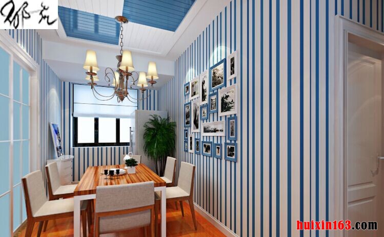 一进到客厅中我们便会感受到一种清新感扑面而来,客厅中的石膏板吊顶采用了平顶式的设计,在四周做了简单的夹层设计,并在夹层处安装了一圈暖黄色的灯带,灯光可以将吊顶照射的非常柔和,中间则悬挂了一盏具有复古特点的灯饰,电视背景墙使用了石膏板做了简单的边框造型设计,中间的墙面上则粘贴了竖条纹的壁纸做装饰,清新、淡雅的色彩搭配,可以在人们长时间观看电视时保护好人们的眼睛不受到伤害,与之相对的沙发背景墙上也粘贴了蓝白相间的竖条纹壁纸,这样的色彩搭配更能突显出本套房屋装饰的主题,上面悬挂了两幅装饰画,可以凸显出房屋主人的品味及爱好,海蓝色的布艺沙发质地非常柔软,搭配上小巧的抱枕更是可以使人们感到无比的轻松舒适。