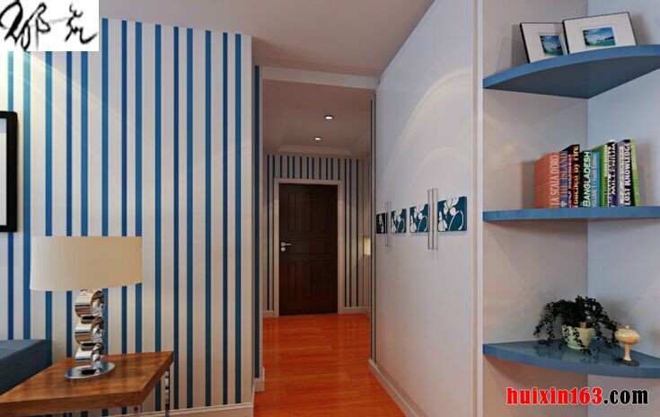 一进到客厅中我们便会感受到一种清新感扑面而来,客厅中的石膏板吊顶采用了平顶式的设计,在四周做了简单的夹层设计,并在夹层处安装了一圈暖黄色的灯带,灯光可以将吊顶照射的非常柔和,中间则悬挂了一盏具有复古特点的灯饰,电视背景墙使用了石膏板做了简单的边框造型设计,中间的墙面上则粘贴了竖条纹的壁纸做装饰,清新、淡雅的色彩搭配,可以在人们长时间观看电视时保护好人们的眼睛不受到伤害,与之相对的沙发背景墙上也粘贴了蓝白相间的竖条纹壁纸,这样的色彩搭配更能突显出本套房屋装饰的主题,上面悬挂了两幅装饰画,可以凸显出房屋主人的品味及爱好,海蓝色的布艺沙发质地非常柔软,搭配上小巧的抱枕更是可以使人们感到无比的轻松舒适。