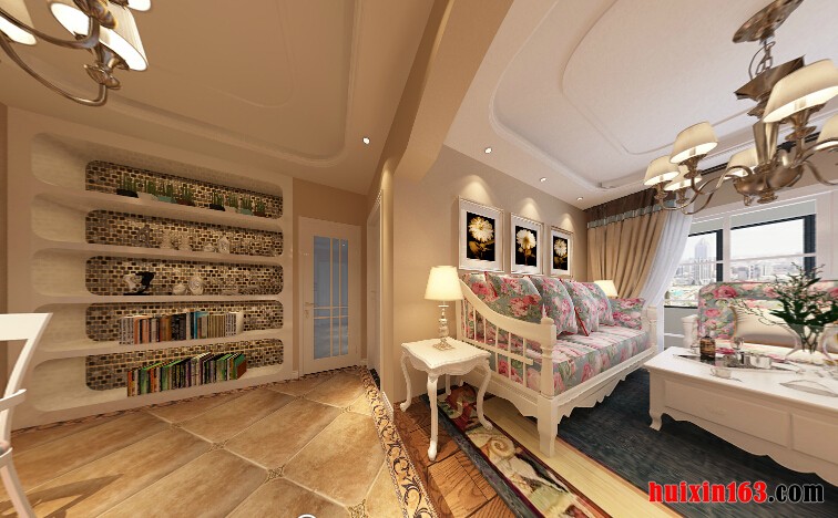 在客厅的顶面上采用石膏板制作出凹凸有致的长方形的吊顶结构,中央悬挂一盏造型大气典雅的吊灯,墙面上悬挂了三幅同样的花朵的图像,给人一种非常干净整洁,充满了自然趣味儿。在地面上采用了宽大的实木地板,同时铺设上色彩夸张,造型大气的地毯,营造出优雅和浪漫自然的双重感受。