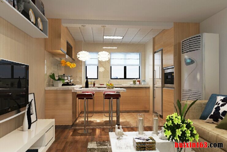 在本案例的设计当中,采用的是现代简约的装修风格,整个空间的格局设计、色彩搭配以及造型的设计都比较别致、新颖,在客厅的装饰布置当中,吊顶的设计比较有设计看点,背景色彩以白色为主,几幅蝴蝶标本壁画的悬挂以及沙发背景墙粘贴的绿植,在局部也演绎出一种形如田园的氛围,浅黄色的沙发布艺添加、搭配上实木铺设的地板、木板上墙处理等等,与白色色彩相辅相成,更是营造出一种浪漫、温馨的氛围,客厅的一侧就是厨房的设计,在格局的设计上虽然不可挑剔,但以开放式的出来的营造空间的氛围还是存在一定的缺陷,烹饪时产生的油烟会直接影响到客厅的空间质量,所以在打造居室环境时应留意这方面的问题。