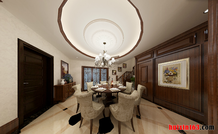 本套为美式风格装修,客厅地面采用的是大理石装修,局部采用地毯进行装饰,墙面采用大理石装修,吊顶采用石膏板进行平顶吊顶,加以水晶灯做装饰,电视墙运用硬包,沙发背景深浅全抛釉瓷砖拼接。电视机,同时沙发选择轻松明快的式样,室内较为丰富,客厅宽敞方正。装修较其它空间要更明快光鲜,通常使用大量的石材和木饰面装饰;这不仅反映在软装摆件上对仿古艺术品的喜爱,同时也反映在装修上对各种仿古墙地砖、石材的偏爱和对各种仿旧工艺的追求整体居室色彩墙面与浅木色轻柔搭配,使其和谐统一,浑然一体。雅致;餐厅:餐厅运用圆形吊顶,与圆形餐桌相呼应。整体感觉到平民的宁静古朴,皇家的奢华贵气,诗人的优雅浪漫。