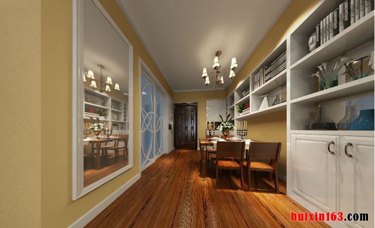 本套为欧美风格装修,客厅地面采用的是地板进行装修,墙面采用米黄色进行装修,吊顶采用石膏板进行平顶吊顶,加以吊灯做装饰,电视背景墙比较短,业主喜欢纯实木的家具,所有在电视背景墙上以满贴素色墙纸为主,两边摆高低柜,简洁又美观;过道:过道比较狭长,在整体房型不改的前提下,从立面上做改动,过道内放入一个嵌入式的书柜,不仅起到了一个装饰作用,更把居家打扮的非常的美观漂亮,餐厅进门比较小,放一些相框,还是要考虑储藏的空间,所有酒柜即不占空间,又美观可储藏,空间南北通透,布局规整,整体给人一种温馨,浪漫的感觉。