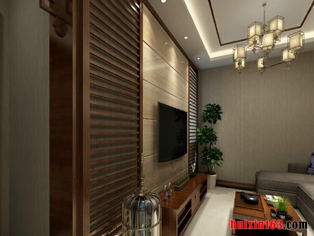 客厅中使用的实木装饰也是比较贯穿整个装修的,电视背景墙的设计中间采用上下方形铺设实木的装饰手法,两边对称性的实木雕刻装饰把客厅的装饰展现出的古典中式气氛更加的浓烈和大气,旁边一个鸟笼的灯具装饰不仅新颖独特,能够把中式的装修风格展现得更加的充分。