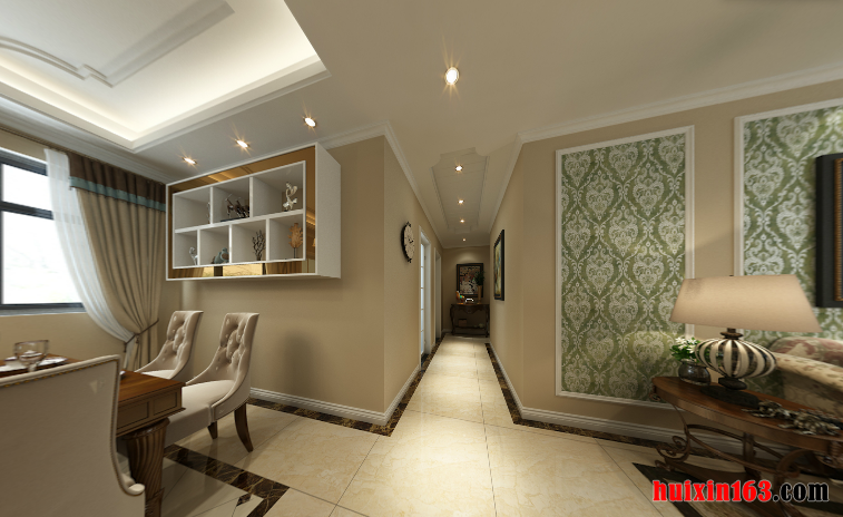 本套为美式风格装修,客厅地面采用的是大理石装修,局部采用的是地毯进行装饰,墙面采用的是乳胶漆进行装饰,吊顶采用石膏板进行平顶吊顶,加以吊灯做装饰,客厅背景墙设计成隐形门,增加衣帽间空间,电视背景墙采用的大理石装修,天然朴实的大理石给人一种心理上的平和恬静之感。选择大理石作为背景墙可以让人心情愉悦,营造出家居风格,大理石墙面积较大,其细腻的纹络、光滑的表层,搭配大气自然的家具更能凸显时尚气息;餐厅:餐厅边上的吊柜装饰美观,省占空间。餐厅边上的吊柜装饰美观,省占空间。整体给人一种逼真自然的感觉。